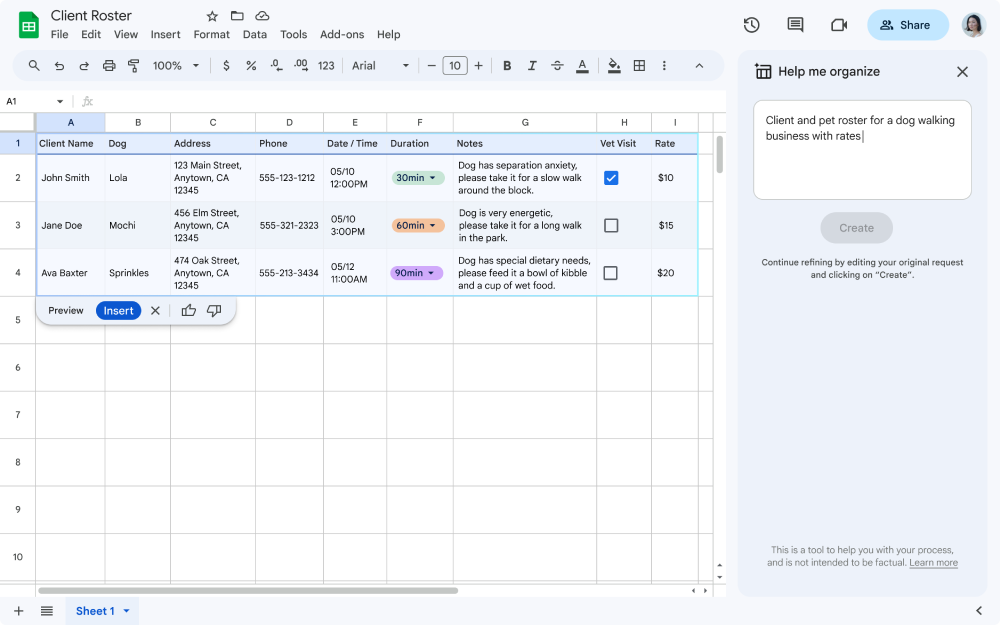 Google Planilhas com o recurso "Ajude-me a organizar"  do Gemini.