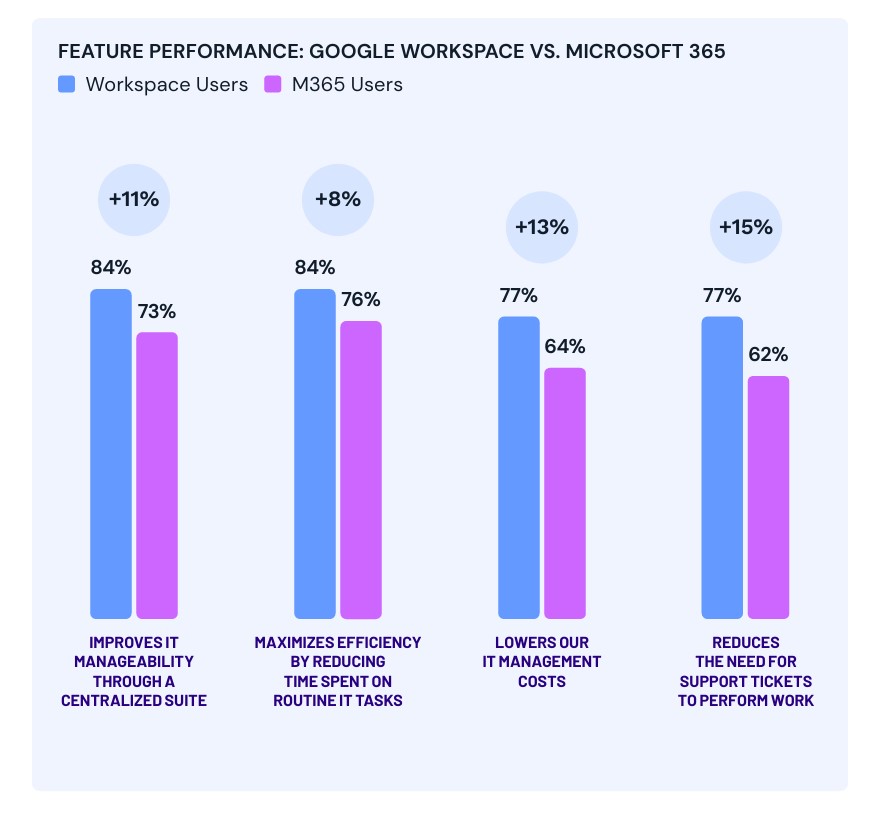 - Gestão centralizada: 84% dos usuários do Google Workspace relatam melhorias na gestão de TI por meio de uma suíte unificada, superando os 73% registrados pelos usuários da Microsoft
